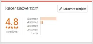 - Recensies worden ook steeds vaker in de zoekresultaten getoond. Dit zorgt ervoor dat je bedrijf (positief) opvalt tussen de zoekresultaten; zie onderstaand plaatje.