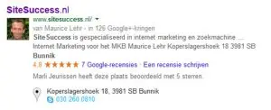 Let op! Google is erg streng in het beoordelen van de recensies. Daarom mag je geen linkjes of de naam van jouw/mijn website in de recensie vermelden. Doe je dat wel, dan is de kans groot dat Google je recensie wegfiltert. Het vermelden van SiteSuccess of Maurice Lehr is geen probleem.